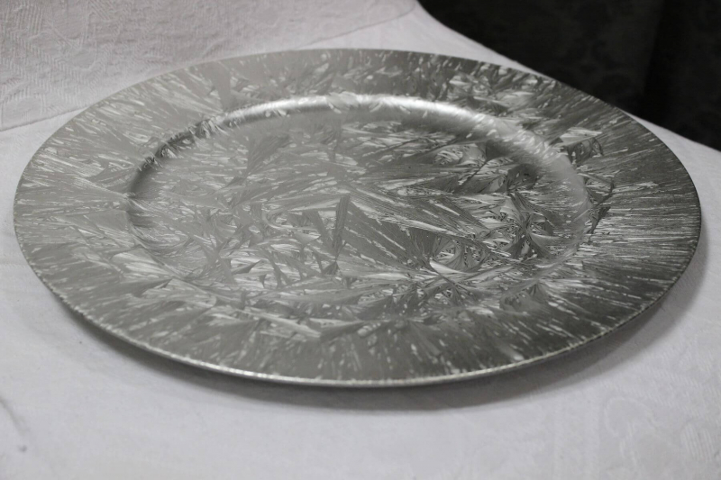 Strieborný zamrznutý štýlový klubový tanier, vhodný na aranžovanie pri rôznych príležitostiach.